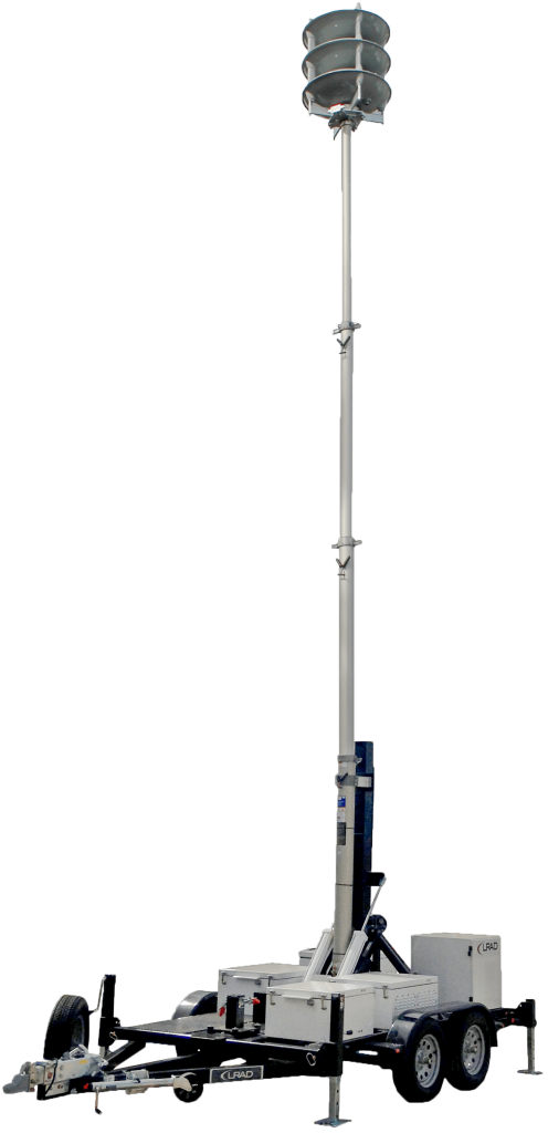 The Genasys 360XT is integrated and mounted on a fully self-contained, ruggedized trailer featuring securely mounted, lockable electronics and equipment enclosures containing the amplifier modules and battery pneumatic systems.